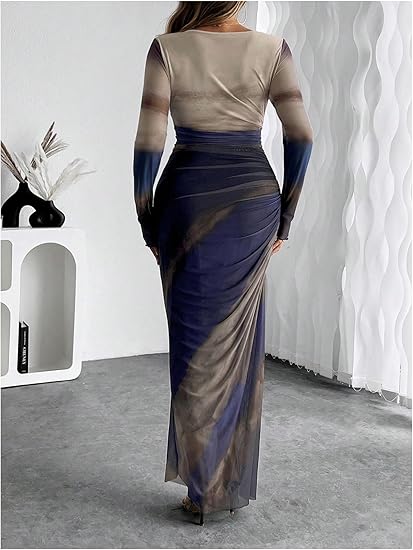 Tie Dye Long Sleeve Maxi Bodycon Ruched Formal Cocktail Dress